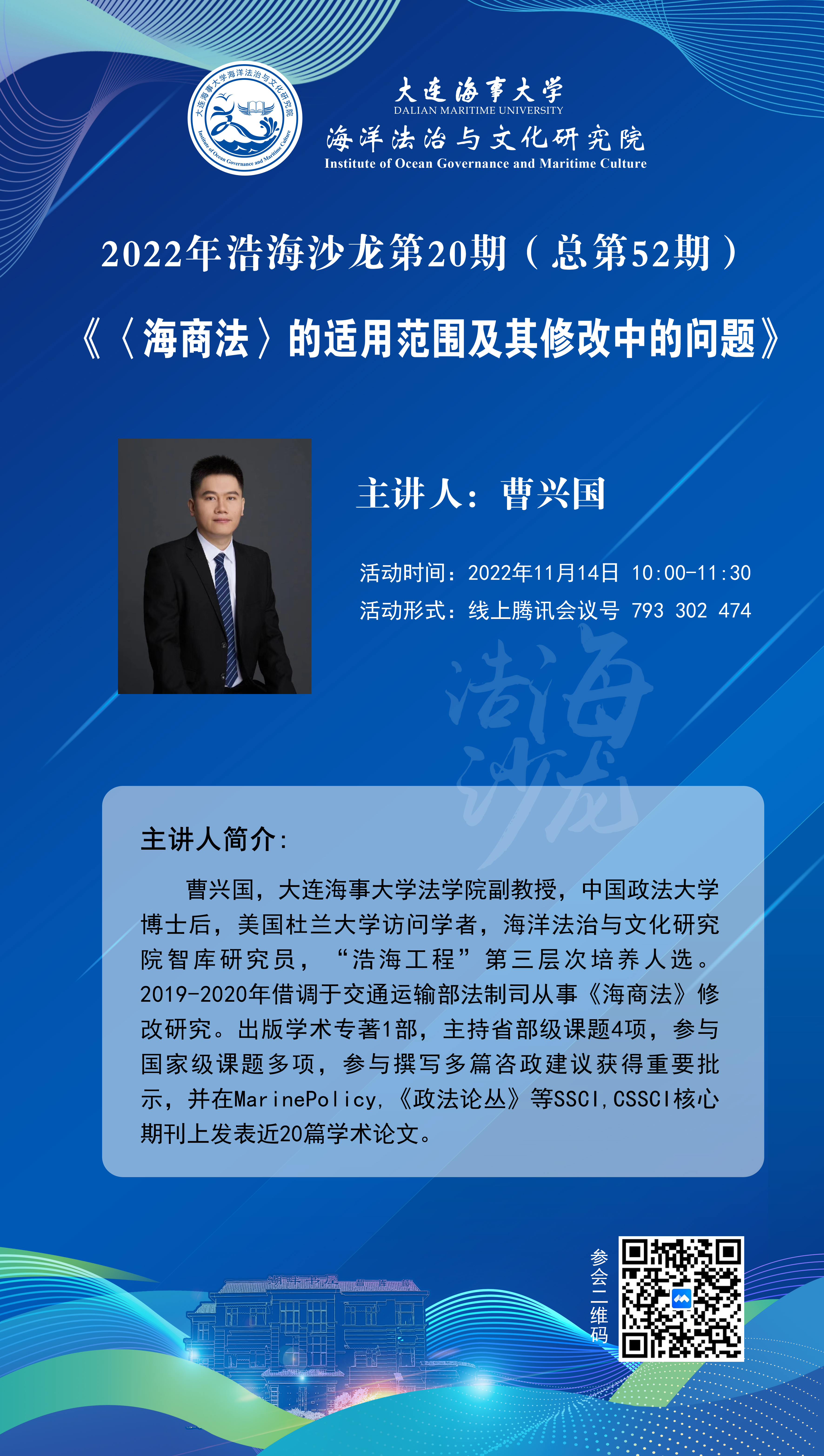 曹兴国,BB贝博艾弗森官方网站法学院副教授,中国政法大学博士后,美国杜兰大学访问学者,海洋法治与文化研究院智库研究员,“浩海工程”第三层次培养人选。2019-2020年借调于交通运输部法制司从事《海商法》修改研究。出版学术专著1部,主持省部级课题4项,参与国家级课题多项,参与撰写多篇咨政建议获得重要批示,并在Marine Policy,《政法论丛》等SSCI,CSSCI核心期刊上发表近20篇学术论文。