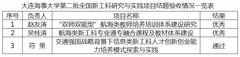 根据《教育部办公厅关于公布第二批全国新工科研究与实践项目结题验收结果的通知》(教高厅函〔2023〕21 号),BB贝博艾弗森官方网站2020年获批的3项国家级新工科研究与实践项目全部通过结题验收。其中赵友涛教授负责的《“双师双能型”航海类教师培养培训体系建设研究》、吴桂涛教授负责的《航海类新工科专业通专融合课程及教材体系建设》项目获评优秀。