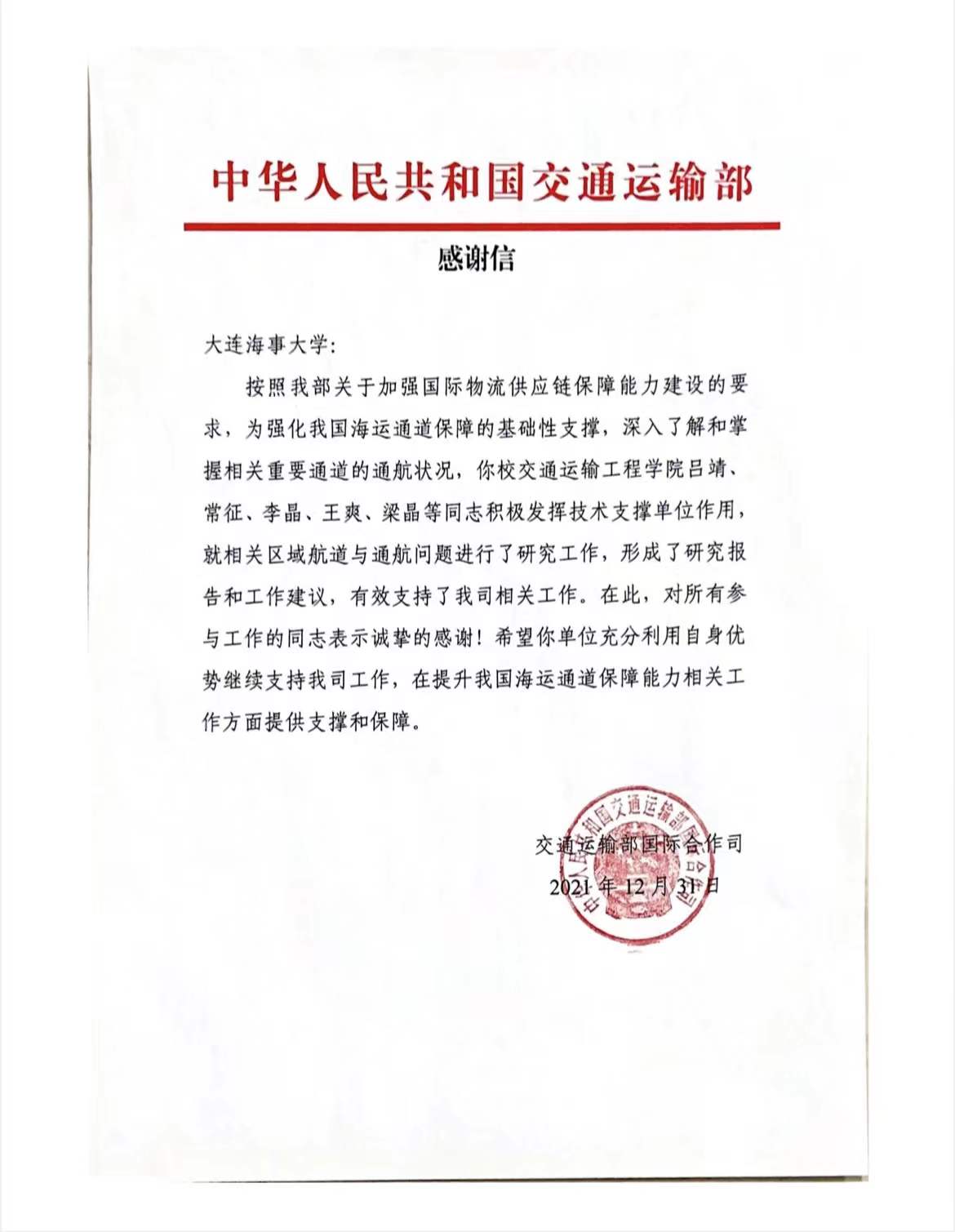 近日,学校收到交通运输部科技司、国际合作司发来的感谢信,对过去一年BB贝博艾弗森官方网站在交通运输行业科技创新领域所做出的贡献表示感谢。