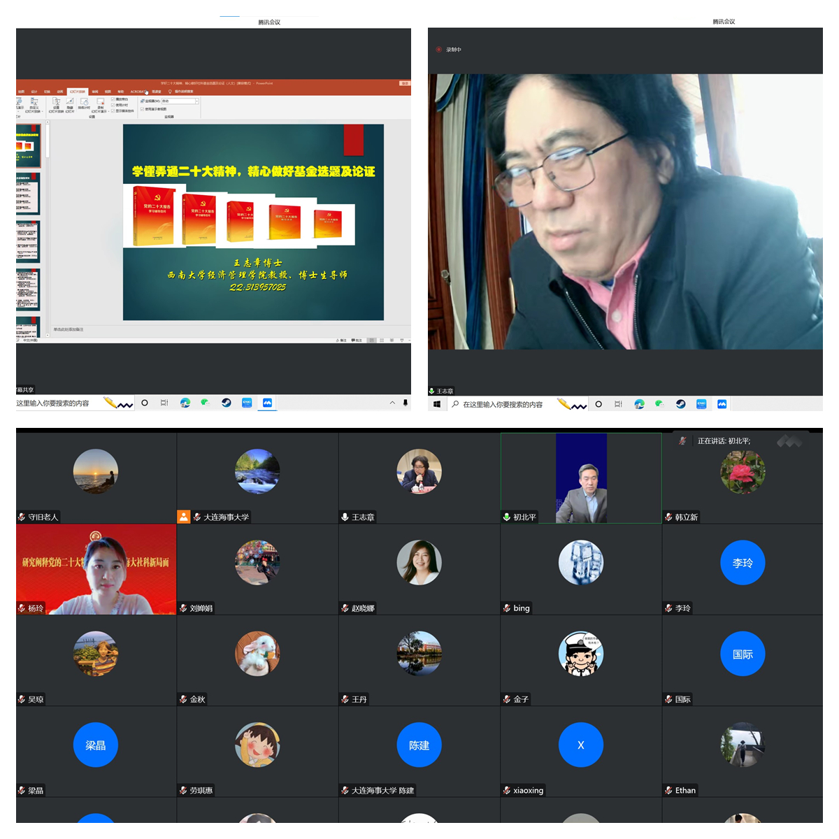 王志章以“学懂弄通党的二十大精神,精心做好基金选题及论证”为主题进行了专题辅导。根据党的二十大报告中提出的新观点、新论断、新思想结合海洋强国、交通强国战略,从国家社会科学基金会议评审专家的视角从项目的选题、选题的误区、论证申报书内容书写案例等三方面进行深入浅出地辅导。王志章表示,申报国家社科基金项目选题要顶天立地、立意高大,立足党和国家事业发展需要,聚焦经济社会发展全局性、战略性和前瞻性重大理论和现实问题。更要结合自身学术专长、研究基础和学术前沿进行深入研究,形成具有现实性、针对性和较高决策参考价值的成果,更好繁荣中国学术,更好服务党和国家工作大局。