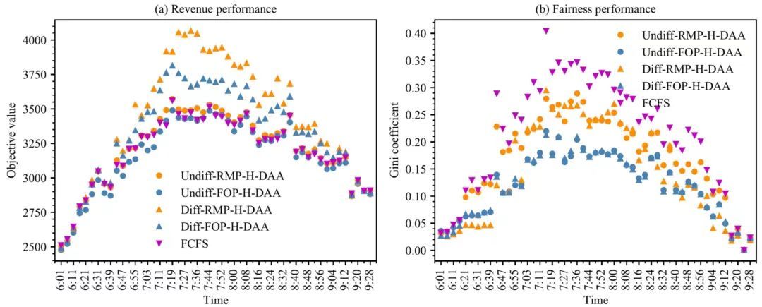 高峰时段客流拥挤是我国大城市轨道交通面临的重要挑战,其不仅导致严重的人群踩踏事故风险,更使得上下游车站的服务水平存在很大差异。在此背景下,设计科学合理的客流控制策略,优化每个站点的上车人数,从而提高列车容量资源的利用效率,并改善服务水平公平性,具有重要的现实意义。在国家自然科学基金项目(批准号:72288101和72101042)和相关项目的资助下,梁金鹏老师及其合作者针对这一问题展开了深入研究。针对客流需求的随机性和动态性特点,论文考虑列车到达每个站点时获知该站的实时客流需求,建立了带约束的随机动态规划模型,目标是要最大化列车总载客量以提高运营效率,并要求满足每个起讫点(origin-destination, OD)乘客的服务水平约束以保证公平性。论文首先从理论上证明了任意给定服务水平目标可行的充要条件,然后将其拓展同时考虑总收益和服务水平目标的可行性问题,并据此设计了近似最优的在线客流控制策略。基于北京地铁的一系列数值试验表明,相较于当前采用的先到先上车策略,论文提出的方法能显著提升系统总载客量,并改善上下游车站的公平性问题(如图2所示)。论文提出的算法框架能够求解一系列带随机约束的随机动态规划和线性规划模型,并可应用于供应链库存、集装箱船舶舱位、港口泊位等一系列资源分配问题中。