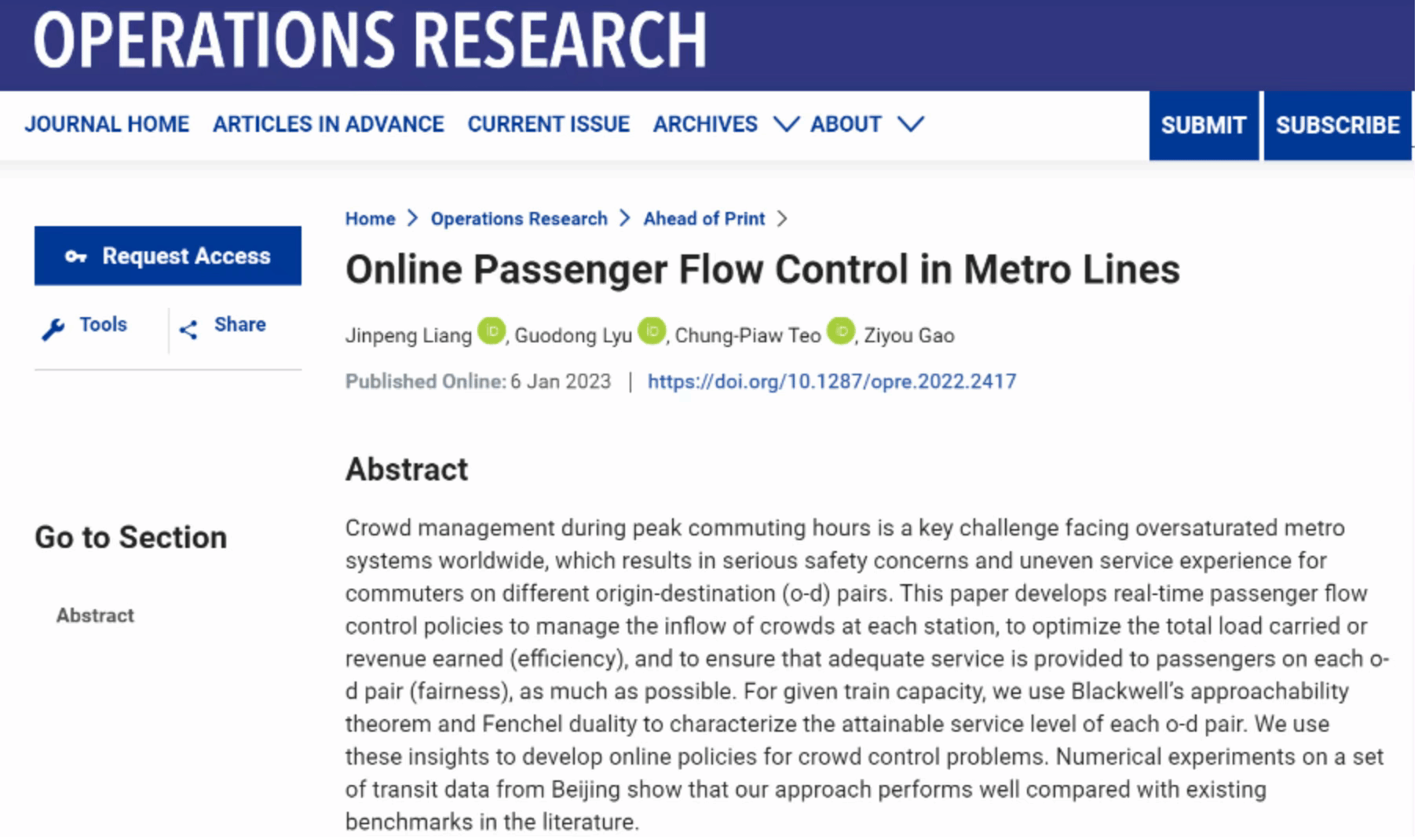 近日,BB贝博交通运输工程学院梁金鹏老师以第一作者在管理科学领域旗舰期刊《Operations Research(运筹学)》在线发表了最新研究论文《Online Passenger Flow Control in Metro Lines》。