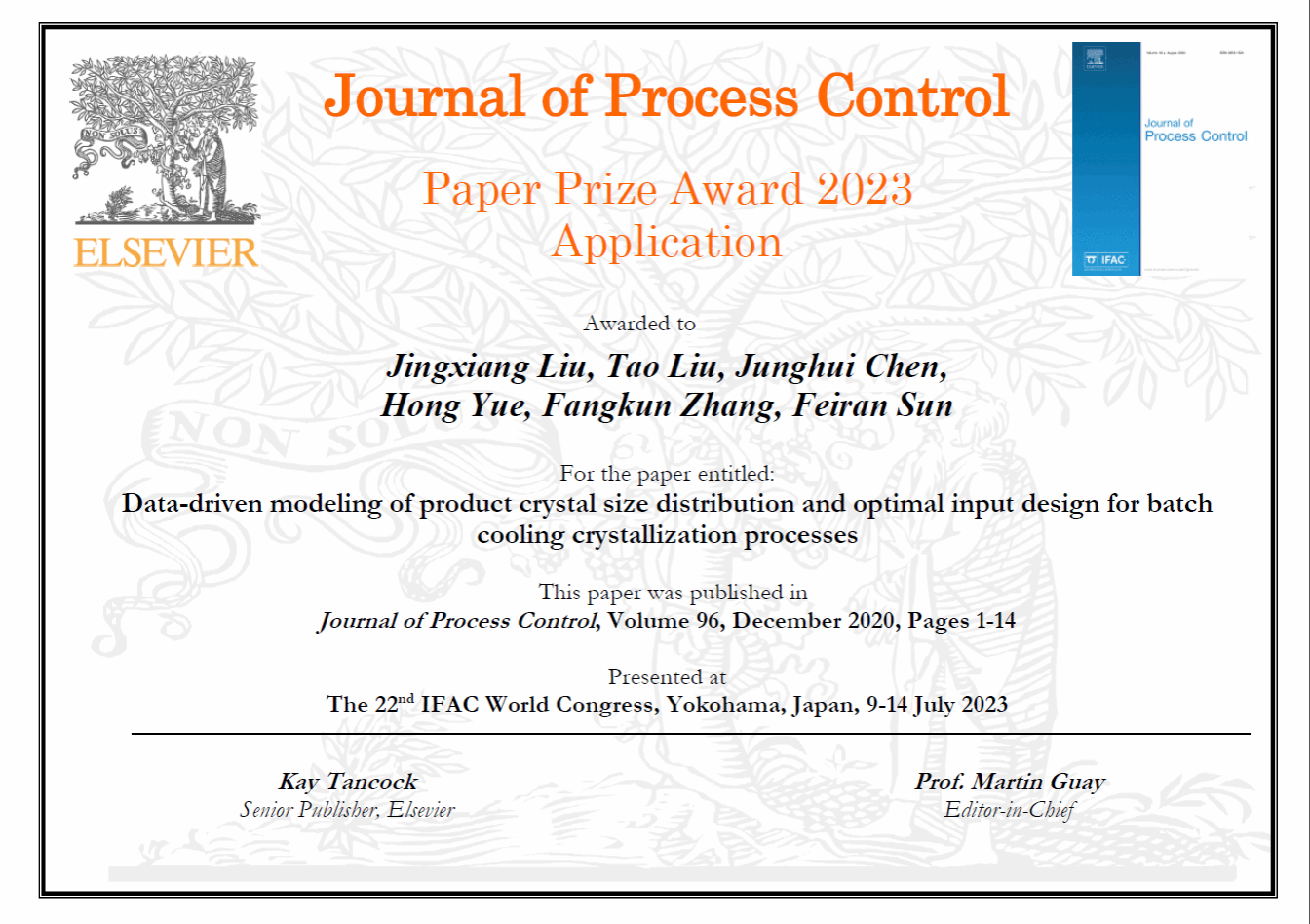 近日,经国际自动控制联合会(The International Federation of Automatic Control,IFAC)奖励委员会通知获悉,BB贝博艾弗森官方网站船舶电气工程学院刘井响副教授作为第一作者,发表在IFAC会刊Journal of Process Control上的论文“Data-driven modeling of product crystal size distribution and optimal input design for batch cooling crystallization processes”喜获2020-2022年过程控制期刊最佳论文奖 (IFAC Journal of Process Control Paper Prize),并受邀参加2023年7月9-14日在日本横滨召开的第二十二届IFAC世界大会上举行的颁奖仪式。