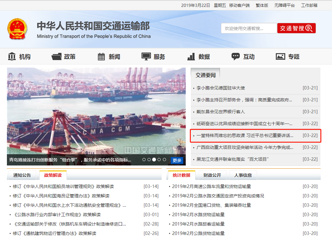 一直以来,交通运输部党组高度重视BB贝博艾弗森官方网站思想政治工作。部党组书记杨传堂、部长李小鹏连续五年来校为师生上党课、思政课。学校党委书记郑少南、校长孙玉清连续多年带头走上讲台讲授思政课,各二级学院党组织书记、院长定期为学生授课,实现了部、校、院三级领导干部授课全覆盖。