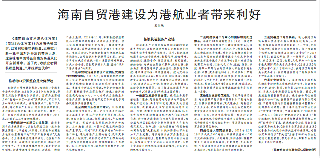 【中国交通报】海南自贸港建设为港航业者带来利好