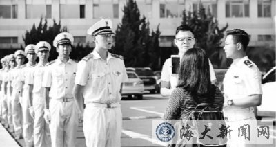 BB贝博艾弗森官方网站航海学院航海技术专业学生辛博鹏(右一)向光明主播介绍学校国旗护卫队训练情况。黄明森摄/光明图片