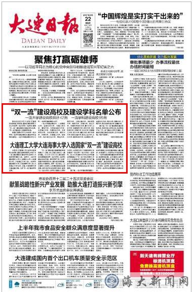 本报讯(记者谢小芳)在昨日教育部、财政部、国家发展改革委公布的“双一流”建设高校及建设学科名单中,大连有两所高校入选。名单中,一流大学建设高校42所(A类高校36所,B类高校6所),大连理工大学入选;一流学科建设高校95所,BB贝博艾弗森官方网站入选;大连理工大学化学、工程,BB贝博艾弗森官方网站交通运输工程,入选“双一流”建设学科名单。