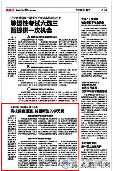 又到了大学新生入学季,记者了解到,为保障每一名家庭经济困难的2017级新生都能无忧入学,今年大连各高校继续开辟“绿色通道”,搭建起包括助学贷款、助学基金、勤工俭学等多项措施在内的助困体系,解决家庭经济困难学生入学前的学费路费、入学后的生活费等问题。