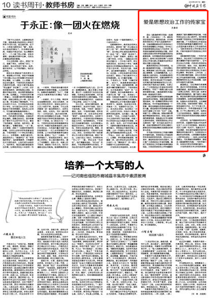 爱是思想政治工作的传家宝,也是《爱是教育的灵魂》一书的逻辑主线。教育是育人成才的过程,其本质是以德育德、以灵魂唤醒灵魂、以人格影响人格的活动。关系教育成败的因素虽然复杂多样,但爱在教育中的前提性、根本性地位是不可动摇的,任何离开爱的教育都是苍白无力的,或根本就不能称其为教育。长期以来,广大思想政治工作者恪守科学的教育理念,书写了一篇篇以爱为主旋律的德育华章,《爱是教育的灵魂》就是一部典型的代表作。