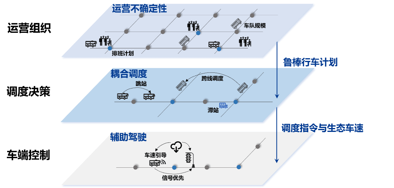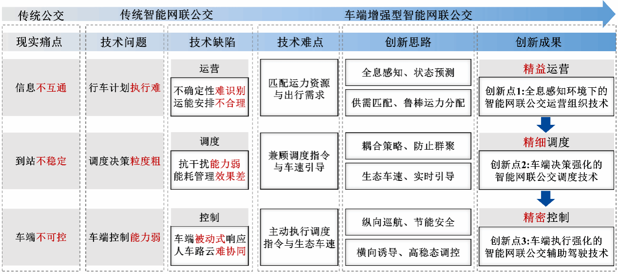 “车端增强型智能网联公交精准调度关键技术”创新成果面向当前城市公交服务效率低、服务可靠性差、能耗排放高三大现实痛点,针对传统智能网联公交行车计划执行难、调度决策粒度粗、车端控制能力弱三大技术难题,在交通强国等国家战略的引领下,在国家重点研发计划、国家自然科学基金等项目的支持下,通过夯实车端能力、增强网联效用,形成了系列创新成果:开辟了全息感知环境下的智能网联公交运营组织技术、研发了车端决策强化的智能网联公交调度技术、攻克了车端执行强化的智能网联公交辅助驾驶技术,实现了智能网联公交精益运营、精细调度、精密控制。研发团队与两家一级供应商联合研发网联公交域控制器,应用于国内前三客车制造企业整车集成,支撑两家商用导航头部企业,以及智能网联汽车独角兽企业开发了网联公交辅助驾驶平台与精准调度系统。成果实现了智能网联公交多模态和全场景落地应用,对于解决我国城市公交运营痛点、促进智能网联技术落地应用、推动我国城市公交转型升级具有重大意义。