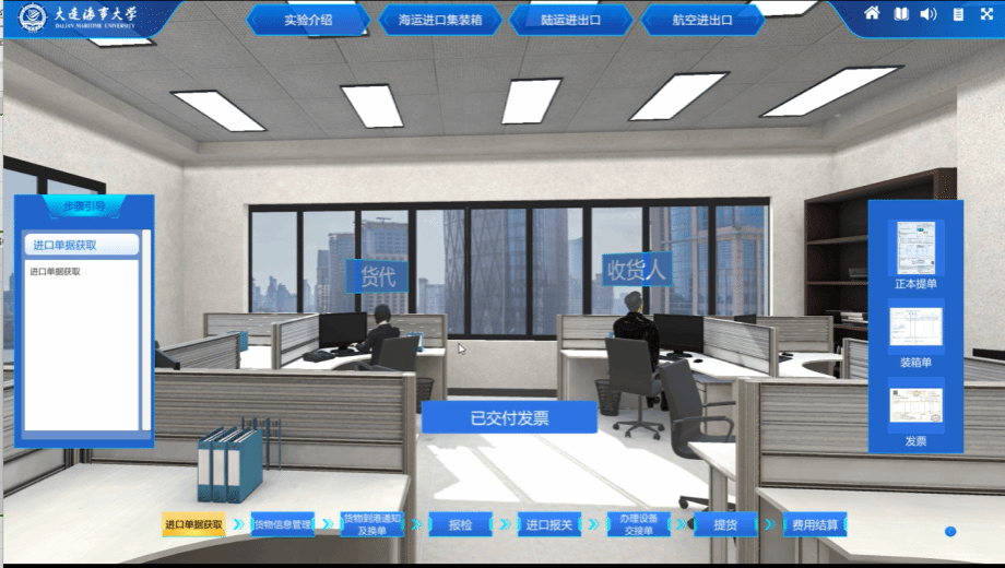 液货装卸虚拟仿真教学实验室以液货船舶货物装卸设备操作为切入点,选取液化气船舶、散装化学品船舶、油轮船舶上的装卸货设备,充分利用虚拟现实等计算机仿真技术,实现液货船设备教学与训练的信息化、网络化和三维情景化。实验室具有高度逼真立体还原船舶实际场景,全任务、高沉浸感的虚拟交互操作和设备原理动画相结合,以学生为中心的自主化和案例化学习等特色。