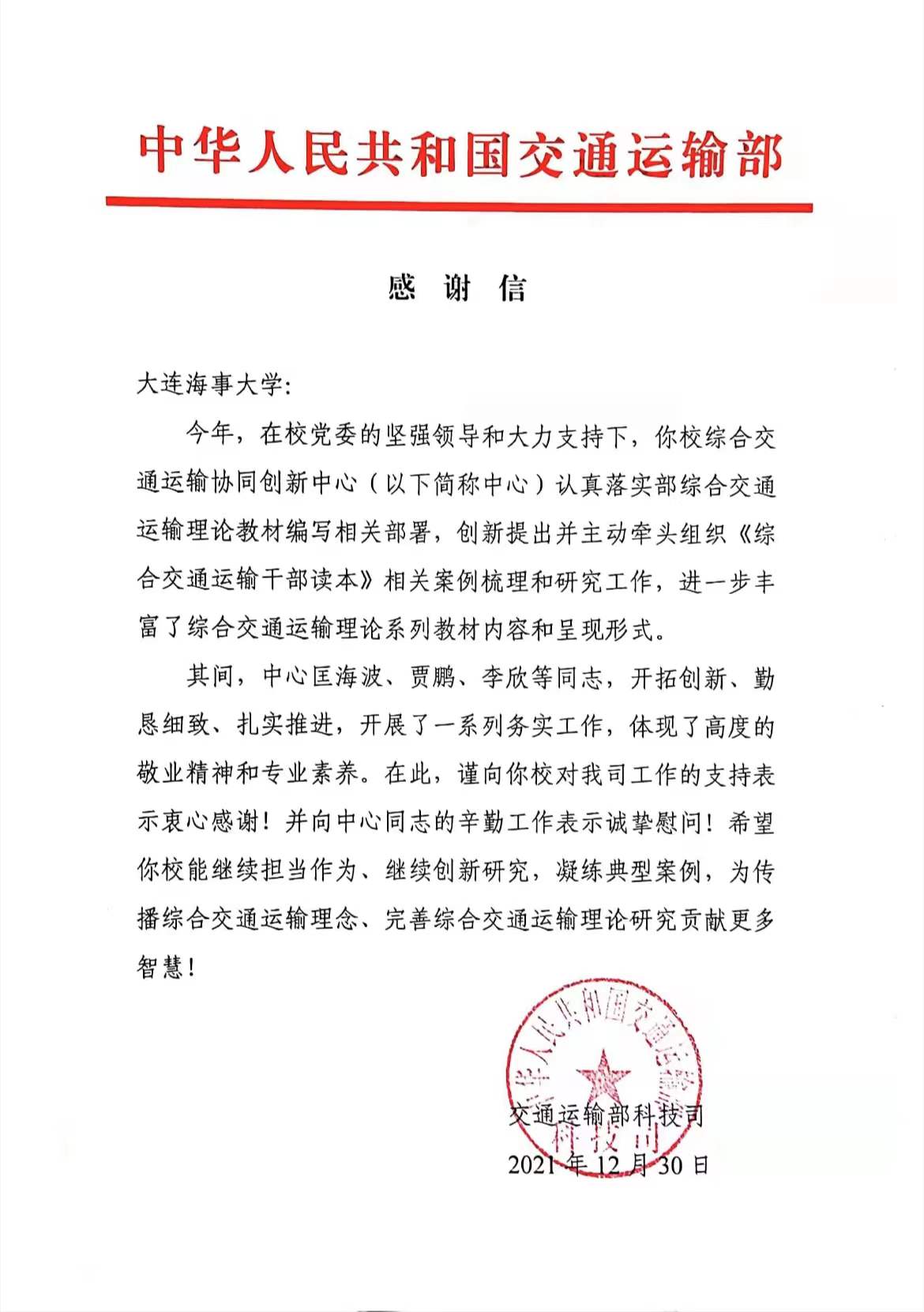 在感谢信中,部科技司、国际合作司分别向BB贝博相关团队、平台和个人发来感谢信,对综合交通运输协同创新中心及其相关团队,对弓永军、匡海波、吕靖、贾鹏、李晶、李欣、常征、王爽、梁晶等同志在相关领域的工作付出表示诚挚感谢。