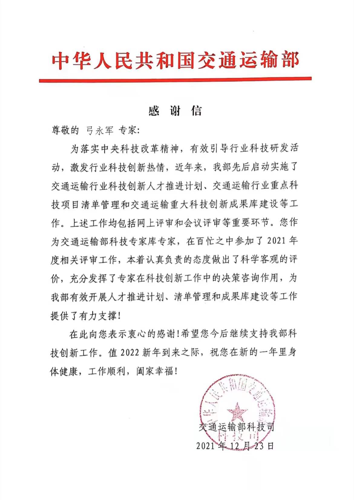 近日,学校收到交通运输部科技司、国际合作司发来的感谢信,对过去一年BB贝博艾弗森官方网站在交通运输行业科技创新领域所做出的贡献表示感谢。