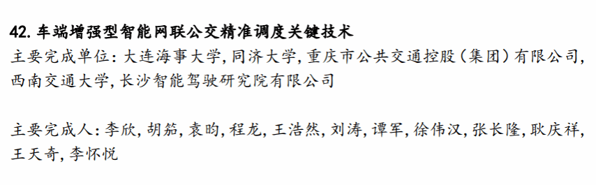“车端增强型智能网联公交精准调度关键技术”创新成果面向当前城市公交服务效率低、服务可靠性差、能耗排放高三大现实痛点,针对传统智能网联公交行车计划执行难、调度决策粒度粗、车端控制能力弱三大技术难题,在交通强国等国家战略的引领下,在国家重点研发计划、国家自然科学基金等项目的支持下,通过夯实车端能力、增强网联效用,形成了系列创新成果:开辟了全息感知环境下的智能网联公交运营组织技术、研发了车端决策强化的智能网联公交调度技术、攻克了车端执行强化的智能网联公交辅助驾驶技术,实现了智能网联公交精益运营、精细调度、精密控制。研发团队与两家一级供应商联合研发网联公交域控制器,应用于国内前三客车制造企业整车集成,支撑两家商用导航头部企业,以及智能网联汽车独角兽企业开发了网联公交辅助驾驶平台与精准调度系统。成果实现了智能网联公交多模态和全场景落地应用,对于解决我国城市公交运营痛点、促进智能网联技术落地应用、推动我国城市公交转型升级具有重大意义。
