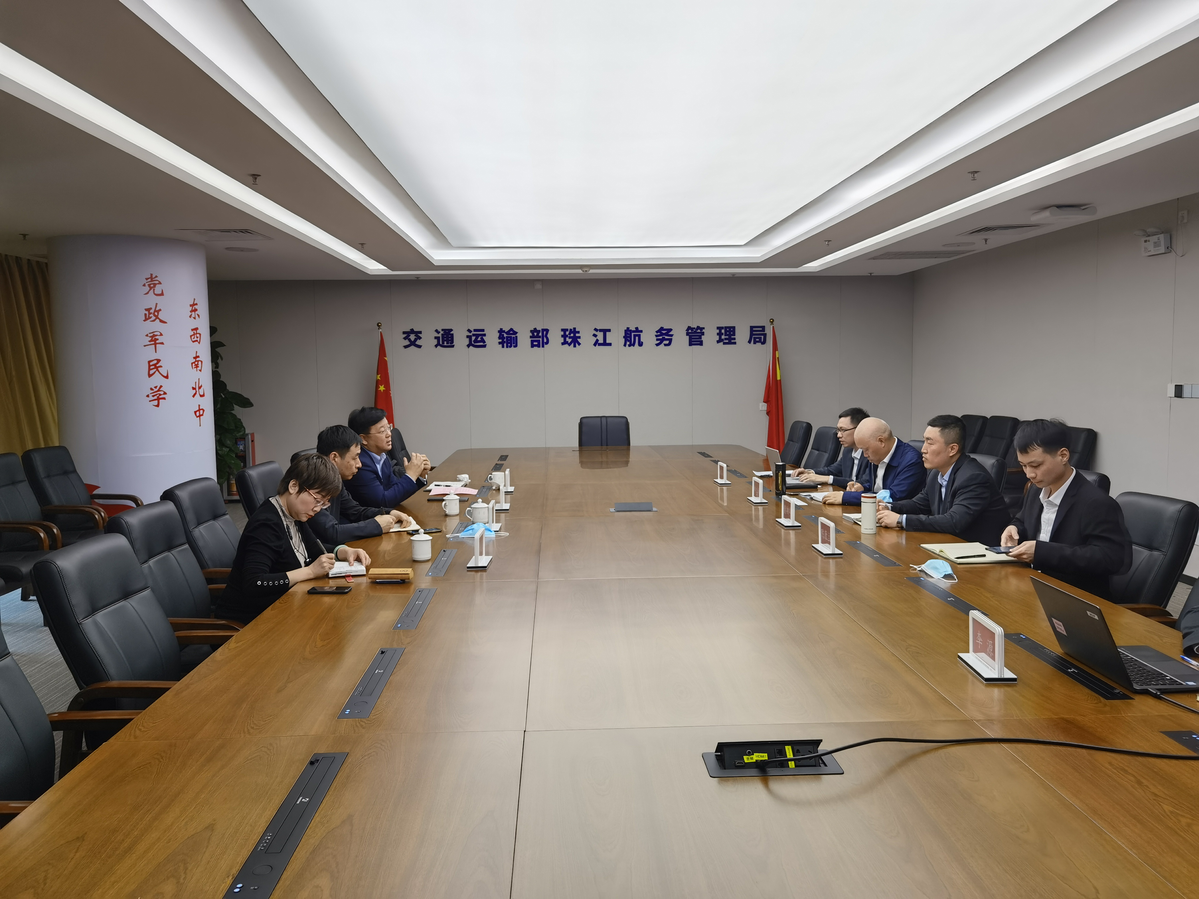 在珠江航务管理局,局二级巡视员林立新、科技信息处处长黄翔宇等参加座谈,双方围绕电子航道图、水上无人机等科技合作内容进行了深入交流,并达成了良好共识。