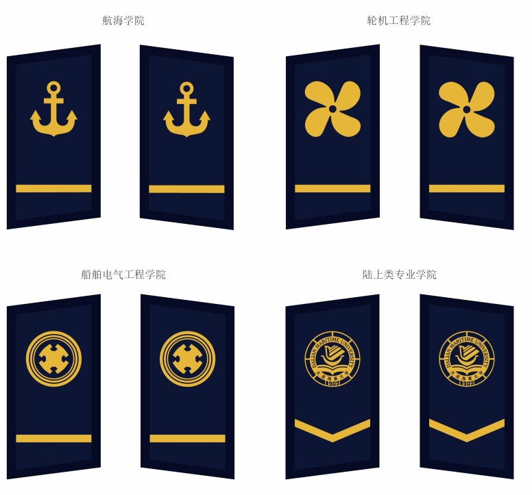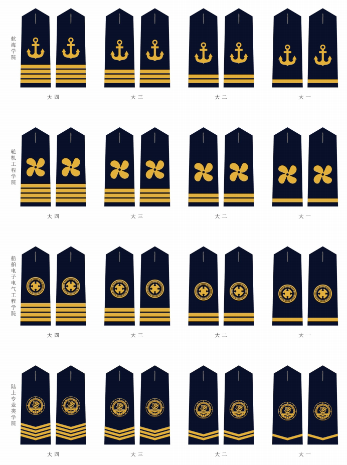 航海类专业本科生肩章中的锚、桨、电机有着鲜明的专业特色,寓示学生对专业的认同感和荣誉感;横杠的数量及粗细代表了不同的年级及是否担任学生干部职务。非航海类专业学生肩章中的校徽标志,寓示学生对BB贝博的归属感和自豪感;本科生折杠的数量代表不同的年级