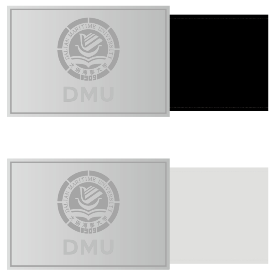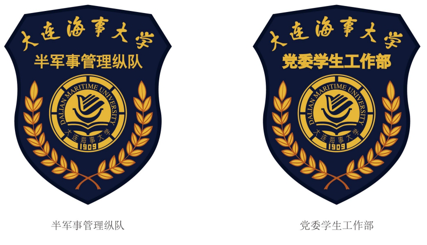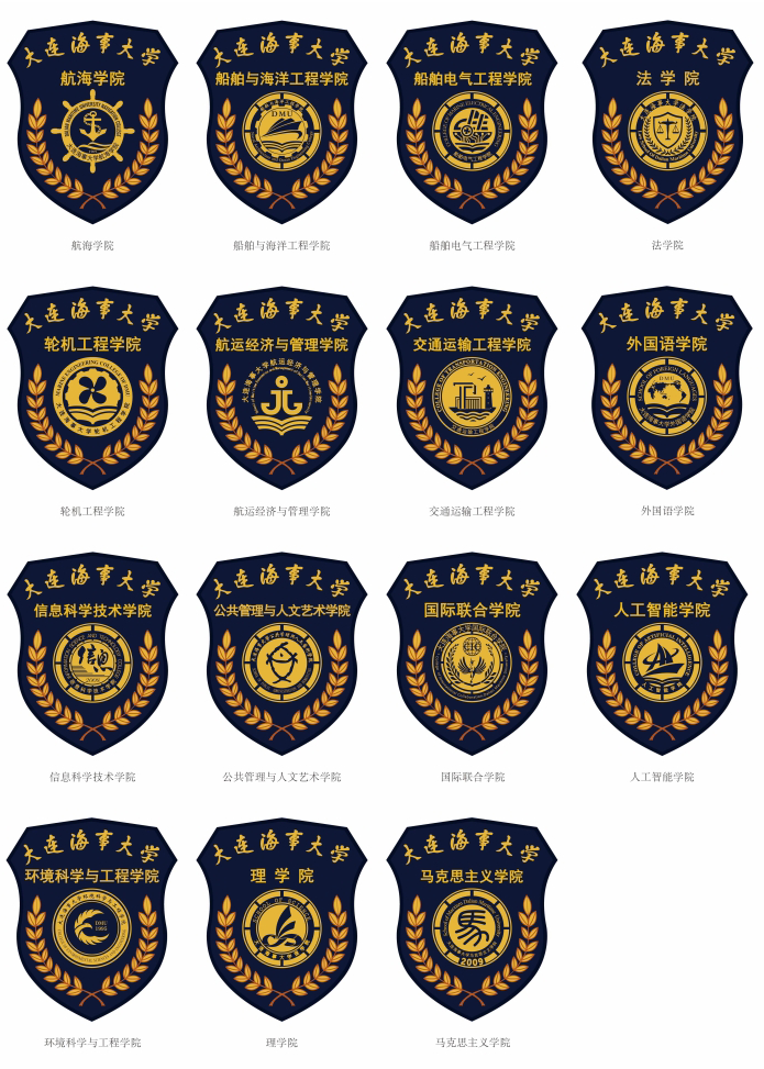 整体造型为四边形,主色调为藏蓝色,中间的图案都为金色,包含校徽(院徽)元素。