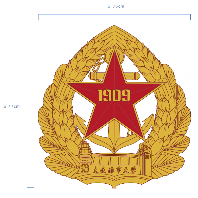 整体造型为船型,红、黄色调搭配,金属帽徽,主体融入五角星、船锚、学校标志性建筑元素,中间空隙处镂空,船体上附56颗立体麦穗造型,整个船体外围由松枝环绕,下部由展开的书页(起伏的海浪)托起。帽托为藏蓝色毛毡。