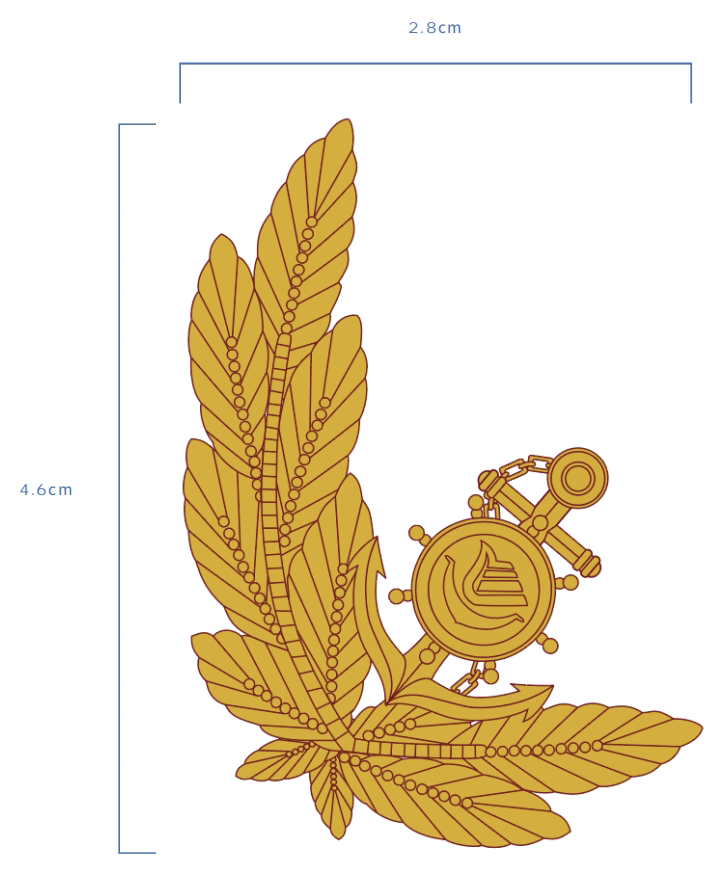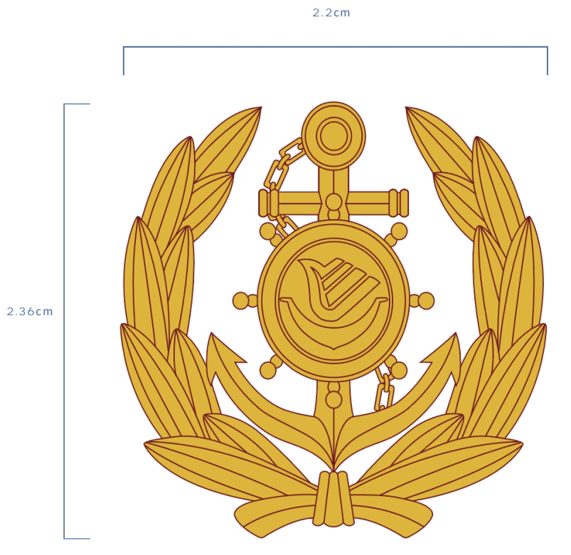 整体造型为圆形,金黄色,金属材质,由橄榄枝环绕船锚、舵轮和BB贝博艾弗森官方网站校徽中船的造型组成。金灿灿的领花象征着荣誉。橄榄枝象征着和平、胜利,环绕船锚、船舵和船,象征BB贝博人矢志实现海洋强国的决心和勇气。